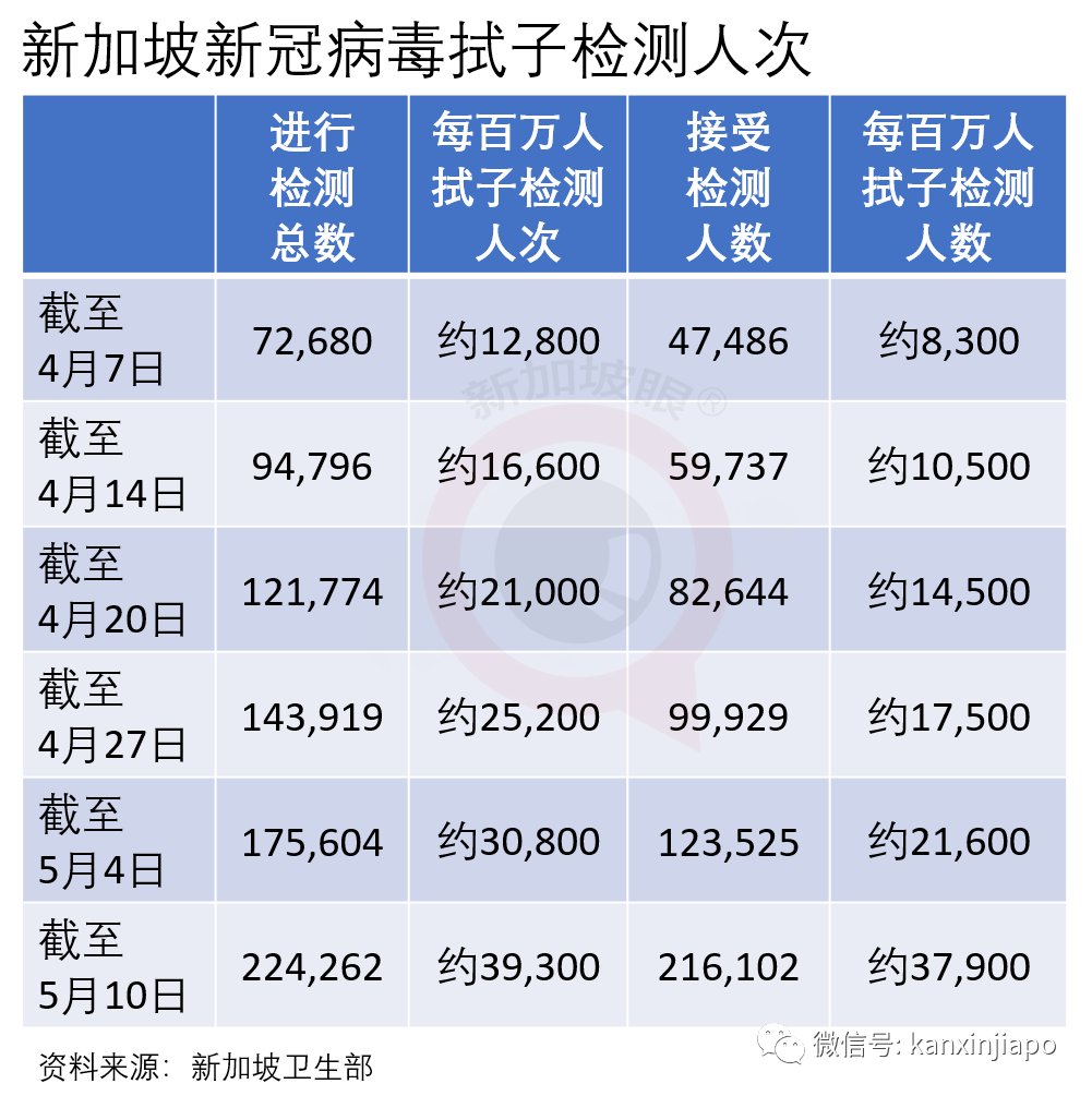 这是卫生部截至5月10日报告的拭子检测次数。从这个表可以推算,4月7至14日是日均3159次,之后每周的日均检测数逐步提高,但也只是三四千,一直到最近(5月5至10日)才提高到日均8109次。简单说,“每天8000次”是最近一周的事。其次,即便每天8000次,也有两个理解误区得注意。首先,这8000次是检测次数,不是检测的人数。检测的人数要比检测的次数少,因为每人得做两次检测或以上,两次检测需要间隔至少24小时。因此,即便每天做8000次检测,也不等于8000人接受检测。还有一个理解误区,就是误以为这8000次检测全用在检测宿舍客工上。其实远远不止。除了宿舍客工之外,必须检测的群体至少还包括:一、在方舱和社区康复设施的一万多病人二、前线医疗人员三、仍在工作一线的必要领域员工四、社区里的体弱和高危群体如安老院和疗养院中的老人和医护五、卫生部随机选择社区其他病患做新冠病毒检测,进行潜在传染源的监测 六、所有学前教育中心职员,等等这样看来,就不难理解为何“每天8000次,但一个月才测了3.2万客工”了。这只是我们根据公开信息所作的推算,具体究竟是否如此,还是得看卫生部将来是否详细解释。客工群体感染率达70%?截至5月13日,卫生部数据显示,集体宿舍客工具体确诊人数为23008人。卫生部也说,目前已测试了客工32000人左右。所以有读者说,这岂不等于70%感染率?按这个感染率,32万名客工的群体岂不得有23万人感染?那就等于群体免疫了。关于这个问题,可以从两个方面探讨:一、从4月初到前不久,对集体宿舍客工的检测重点是出现症状人员。很多这些人员都是感染者,既然以他们为重点检测对象,检测的“命中率”自然就比较高。因此,现阶段计算出来的感染率很高,并不让人感到意外。二、卫生部说,目前的检测重点已经转移到未出现症状的客工。这些人有可能是无症状感染者,一经检测可能就确诊;但也有不少可能是未受感染的健康客工。这一个月来,许多客工已经分流到临时宿舍,降低了宿舍的聚居密度,也降低了感染概率。因此,接下来检测工作的“命中率”或许比目前的略低一些。《联合早报》报道,伊丽莎白诺维娜医院传染病专科医生梁浩楠预测,未来几周的新增病例会维持在每天800起或更多。然而,梁浩楠认为,所谓“每日新病例”应该是早前已受感染的病例,但是因为近日当局加紧(对无症状人员的)检测,才陆续确诊。换句话说,所谓的“每日新增确诊”是过去一两周发生的感染,有一段滞后时间。因此,他说“人们无须过于焦虑”。新加坡国立大学苏瑞福公共卫生学院副院长古阿烈副教授(Alex Cook)接受《联合早报》采访时说,实际染病人数可能比确诊数字更高。不过他指出,如果确诊的很多人属于轻微症状,意味着疫情趋缓。