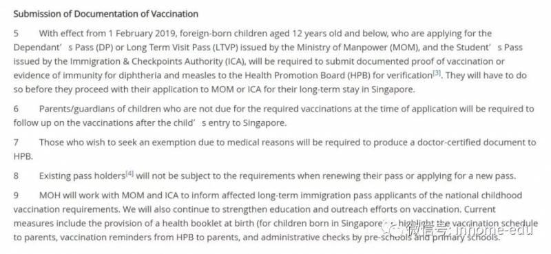 从2019年2月1日起,12岁以下未在新加坡出生的外籍儿童申请新加坡长期居留签证时,必须先向保健促进局提交曾接受过白喉(diphtheria)及麻疹(measles)疫苗的相关证件。