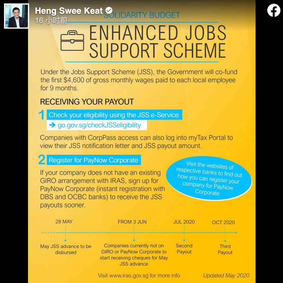 部长也在帖文中,向那些经营状况良好,因此决定退还补助金的公司表达感谢。政府已经在上个月向超过14万名雇主发放第一轮的薪金补贴,接下来还会在7月和10月发放另外两轮补助金。