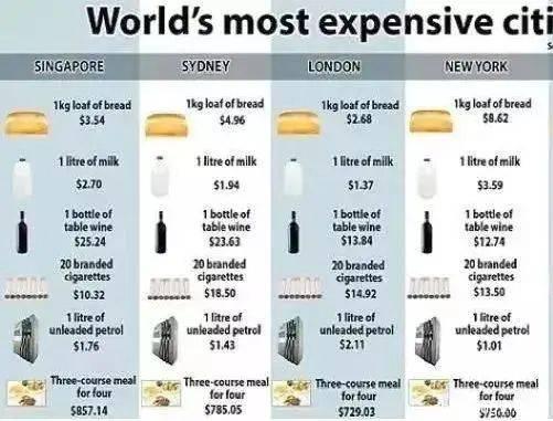 2015年,新加坡被经济学家杂志评为世界上生活成本贵的城市。在上图中你可以看到,新加坡的面包和牛奶价格比伦敦还要贵,烟酒被政府课以重税,汽油价格比纽约更贵,而去饭店就餐的价格全世界较高。新加坡的烟和酒是被政府课以重税的,因此烟酒的价格非常高。比如上图显示,新加坡的啤酒价格在世界上属于较高之一。