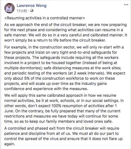 国家发展部部长黄循财昨日在Facebook的帖子中说,即使到6月1日之后,许多现行的限制和断路器措施仍将持续一段时间。
