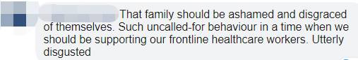 “那个家庭应该为自己感到羞耻和耻辱,在这个我们应该支持前线医护人员的时候, 这种行为太恶心了!”