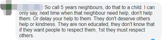 “5年的邻居这样对待一个孩子?我只能说,下次他们需要帮助的时候,不要帮他们。这种人不值得人家的帮助和善意。他们没受过教育,不懂得想要获得他人的尊重,首先要尊重他人。”