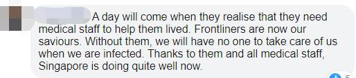 “总有一天他们会需要医护人员去拯救他们的生命。前线医护现在就是我们的救世主,没有他们我们感染的时候就没人来救,感谢所有的医护工作者,新加坡现在做得非常好!”