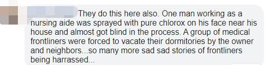 “还有很多这样的事情,医护人员脸上被喷消毒液,差点失明。一群一线医护被业主和邻居赶出宿舍...”