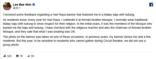 一名网民日前(16日)在社交媒体Facebook贴文并附上一张横幅的照片。照片中可见李美花身穿一套红色的马来套装和头巾,布条上以英文和马来文写道:“恭祝所有穆斯林居民开斋节快乐。”