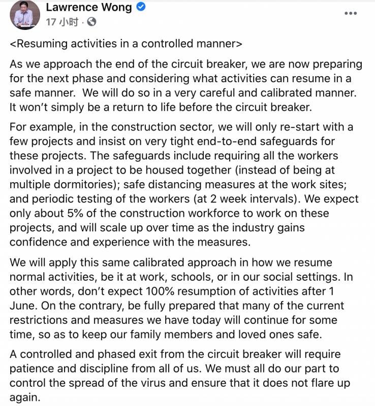 5月17日,黄循财在Facebook上发表了一篇文章,他说:“政府现在正在为下一阶段做准备,并考虑哪些活动可以安全恢复。”