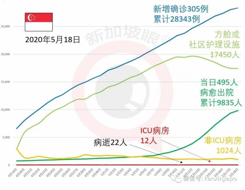 5月18日,新加坡新增确诊305例,累计28343例。17450人在方舱或转隔离设施。在院有1024人,另有12人在加护病房(ICU);当日病愈出院495人,累计出院9835人。病逝累计22人。