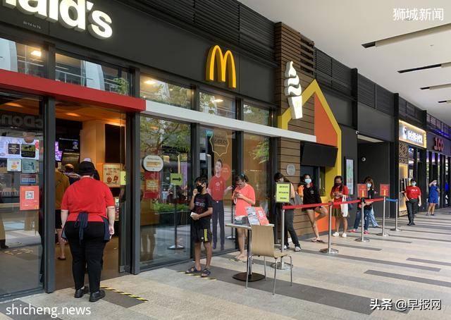 新加坡麦当劳快餐店在职员染病后关闭20多天,本月11日重开。图为顾客当天在分店外排队。(邬福梁摄)