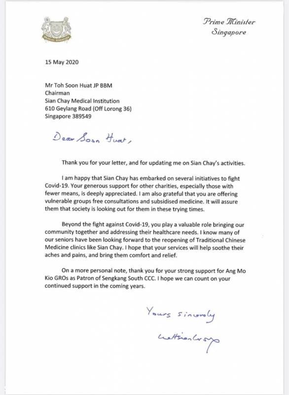 2020年5月15日,李显龙总理给善济医社卓顺发太平绅士的一封信——