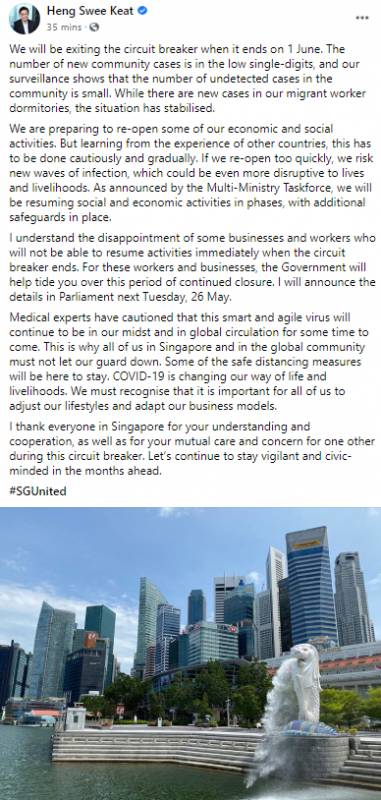 新加坡目前的新冠病毒阻断措施将持续至6月1日,从6月2日起约有三分之一的新加坡员工可以出门正常工作,而学前教育机构和幼儿园也将有秩序开学。