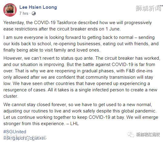 随著抗疫跨部门工作小组(20日)宣布我国的病毒阻断措施将于6月1日结束,分三个阶段逐步解封,李显龙总理今日提醒国人,新加坡不会永远封闭,因此国人必须开始适应新常态。
