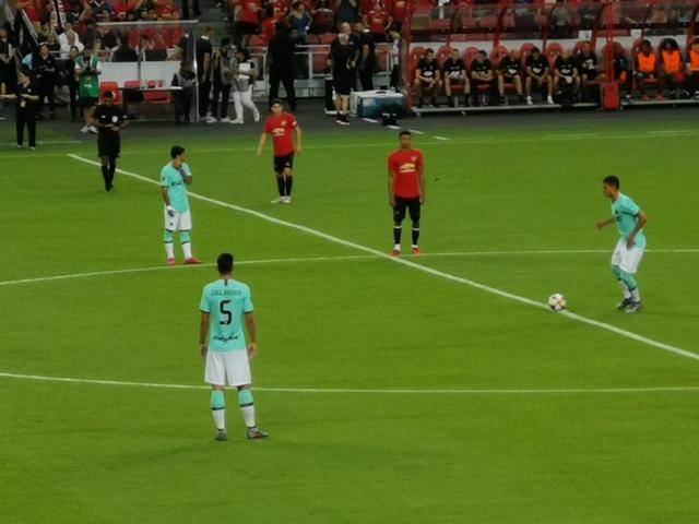说实话,球场里只有零星几个球迷身着蓝黑条纹的国米球衣,从现场播报双方首发球员名字的语速就可以分辨这里简直就是老特拉福球场。每播报一位曼联球员名字,人群中就爆发出掌声欢呼声。而国米的出场球员名字,播报员几乎没有任何停顿,一口气读完的,以免被嘘。