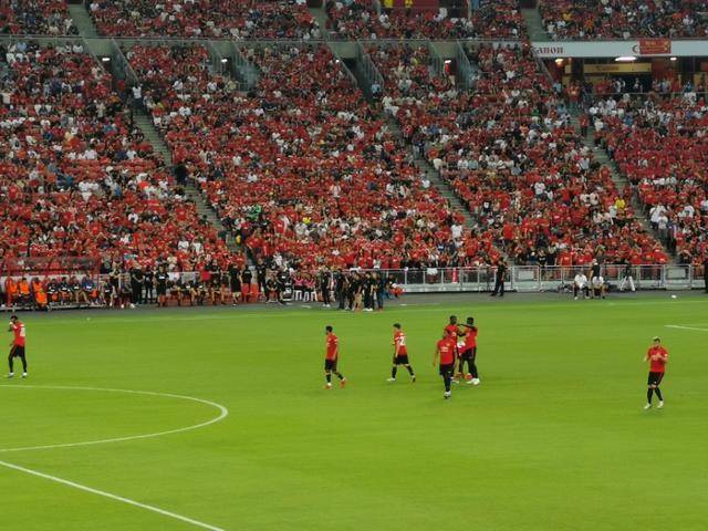 全场5万多球迷,几乎是一片红色的海洋。如果你仔细看,队服有Sharp, AIG, Aon等不同时代不同赞助商胸前,球衣背后的球星有贝克汉姆,C罗,坎通纳,当然目前这支队伍博格巴,马夏尔,拉什福德圈粉最多。总之,曾经的英国殖民地 - 新加坡,有无数红魔的球迷(当然也有来凑热闹的伪球迷)。