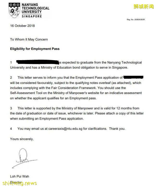 学费资助计划的学生在毕业之际,就算还没找到工作,也会收到一封来自新加坡人力部的EP批准信件。