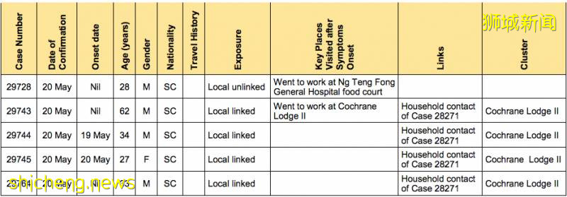 (来源:Orange Valley) 另外,有三个感染群在过去两轮潜伏期(28天)内没有再出现新的病例,因此卫生部宣布关闭这些感染群。 它们是位于东海岸路的尚养生(907 East Coast Road)、芽笼14巷的永丰阁(10 Lorong 14 Geylang),以及尼德路112号(112 Neythal Road)感染群。 5月21日其他感染群情况 【Acacia Lodge感染群】病例:新增2例,累计193例 【Alaunia Lodge感染群】病例:新增4例,累计249例 【Avery Lodge Dormitory感染群】病例:新增12例,累计472例 【Cassia @ Penjuru感染群】病例:新增24例,累计465例 【Cochrane Lodge II 感染群】病例:新增6例,累计394例 【Homestay Lodge 感染群】病例:新增17例,累计435例 【Hulett Dormitory感染群】病例:新增2例,累计467例 【Joo Koon Lodge感染群】病例:新增2例,累计126例 【Jurong Apartments宿舍感染群】病例:新增4例,累计135例 【Jurong Penjuru宿舍感染群】病例:新增70例,累计1014例 【85 Kallang Dormitory宿舍感染群】病例:新增1例,累计163例 【Kian Teck Dormitory感染群】病例:新增13例,累计402例 【Kian Teck Hostel 感染群】病例:新增1例,累计83例 【Kranji Lodge I 感染群】病例:新增2例,累计513例 【The Leo dormitory感染群】病例:新增2例,累计210例 【North Coast Lodge感染群】病例:新增3例,累计500例 【SCM Tuas Lodge感染群】病例:新增9例,累计252例 【Seatown Dormitory 感染群】病例:新增11例,累计474例 【Shaw Lodge感染群】病例:新增13例,累计324例 【SSKBJV Dormitory感染群】病例:新增1例,累计315例 【Sungei Tengah Lodge感染群】病例:新增13例,累计1874例 【Tech Park Crescent dormitory感染群】病例:新增2例,累计132例 【Tuas South Dormitory感染群】病例:新增10例,累计401例 【Tuas View宿舍感染群】病例:新增3例,累计1311例 【Westlite Manda宿舍感染群】病例:新2例,累计478例 【Westlite Toh Guan宿舍感染群】病例:新增5例,累计438例 【Westlite Woodlands宿舍感染群】病例:新增55例,累计262例 【Woodlands Lodge I感染群】病例:新增6例,累计369例 【Woodlands Lodge II感染群】病例:新增1例,累计254例 【20 Benoi Lane感染群】病例:新增1例,累计39例 【24 Benoi Place感染群】病例:新增2例,累计83例 【60 Benoi Road感染群】病例:新增1例,累计42例 【2 Fan Yoong Road感染群】病例:新增11例,累计96例 【23 Kaki Bukit Road 6感染群】病例:新增3例,累计72例 【3 Kian Teck Crescent感染群】病例:新增3例,累计39例 【19 Kian Teck Road感染群】病例:新增1例,累计43例 【10 Kranji Link感染群】病例:新增4例,累计45例 【12 Loyang Drive感染群】病例:新增1例,累计51例 【119 Neythal Road感染群】病例:新增1例,累计8例 【63 Senoko Drive感染群】病例:新增1例,累计65例 【29 Senoko South Road感染群】病例:新增2例,累计7例 【33 Senoko Way感染群】病例:新增1例,累计101例 【10 Shaw Road感染群】病例:新增1例,累计265例 【17 Shaw Road感染群】病例:新增1例,累计141例 【17 Soon Lee Road感染群】病例:新增2例,累计42例 【8 Sungei Kadut Loop感染群】病例:新增44例,累计61例 【33 Sungei Kadut Loop感染群】病例:新增2例,累计91例 【53 Sungei Kadut Loop感染群】病例:新增2例,累计65例 【1 Sungei Kadut Street 4感染群】病例:新增2例,累计14例 【2 Sungei Kadut Street 4感染群】病例:新增6例,累计26例 【10 Tagore Drive感染群】病例:新增1例,累计44例 【1020 Tai Seng Avenue感染群】病例:新增6例,累计137例 【Tampines Street 62感染群】病例:新增1例,累计104例 【5 Tech Park Crescent感染群】病例:新增1例,累计62例 【11 Tech Park Crescent感染群】病例:新增1例,累计152例 【80 Tuas Avenue 1感染群】病例:新增2例,累计101例 【16 Tuas Avenue 3感染群】病例:新增5例,累计84例 【15 Tuas View Close感染群】病例:新增1例,累计22例 【137 Tuas View Square感染群】病例:新增5例,累计27例 【29 Tuas View Walk 2感染群】病例:新增1例,累计15例 【7 Woodlands Industrial Park E1感染群】病例:新增1例,累计13例 【9 Woodlands Industrial Park E1感染群】病例:新增1例,累计30例 【8 Martin Place感染群】病例:新增1例,累计62例 【107 West Coast 感染群】病例:新增5例,累计110例 【9 Tuas Avenue 1感染群】病例:新增6例,累计106例 【12 Tuas Drive 1感染群】病例:新增3例,累计53例