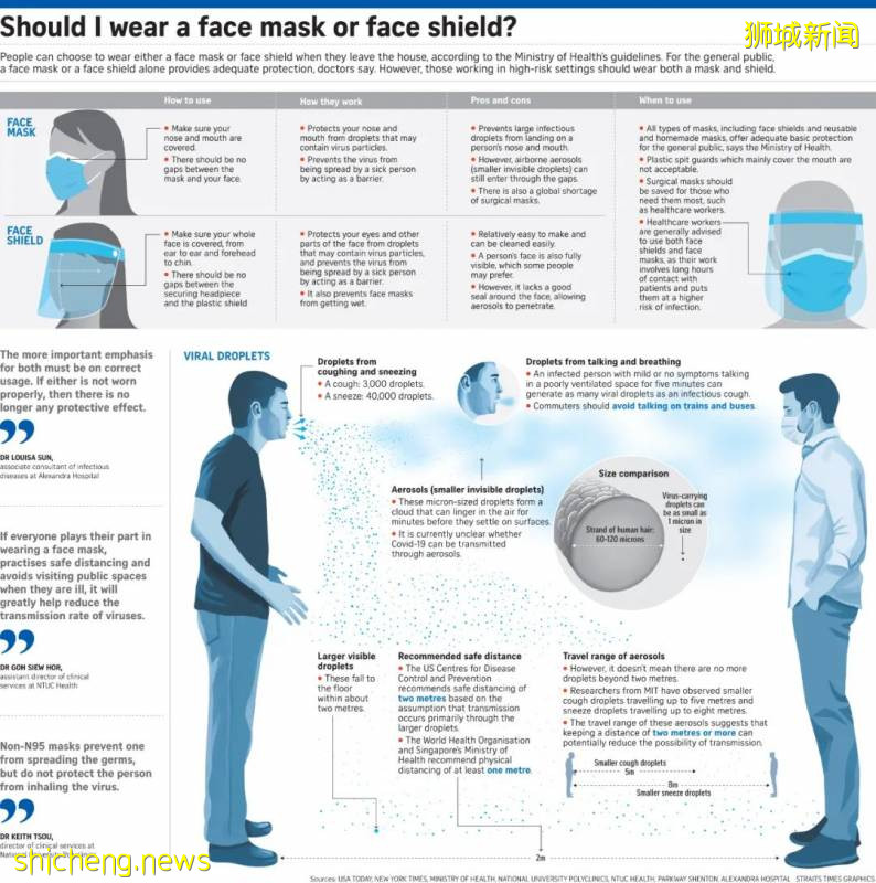 (来源:海峡时报) 戴口罩是最基本的防护步骤,可防止大的传染性飞沫落在人的鼻子和嘴巴上。但是,空气中的气溶胶(微米级别的液滴)仍可以通过空隙进入。 面罩可以保护我们的眼睛和脸部其他部位免受可能含有病毒颗粒的飞沫的侵害,也相对更容易制造一点。