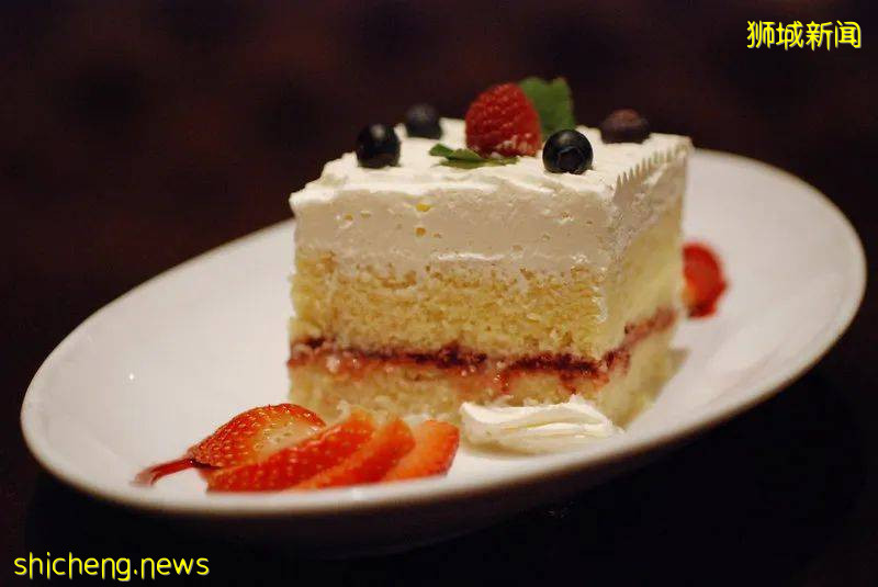 Tres Leches蛋糕是用3种奶油制作而成,再搭配上新鲜的蓝莓和开心果,口感酸甜,入口即化,售价52新币。