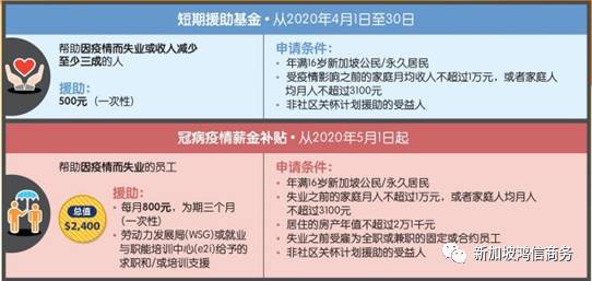 其中之一是短期援助基金,包括一次性的$500新币提供给需要资助的新加坡人,和冠病疫情薪金补贴,主要帮助因病情而失去工作的员工,包括持续三个月的援助,每个月$800新币。