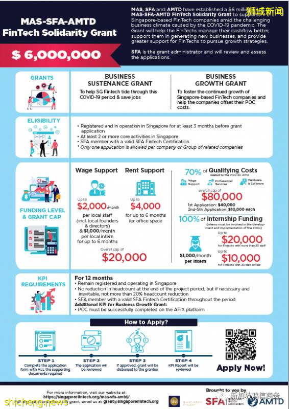 除此以外,5月18日起,金融科技FinTech公司也能够额外申请应对病情的补贴,帮助他们维持其运营,总资助金为600万新元。符合需求的公司能够多达4万元津贴,提呈的概念验证之后可获多达1万元津贴,每家公司所获津贴总额顶限为8万元。
