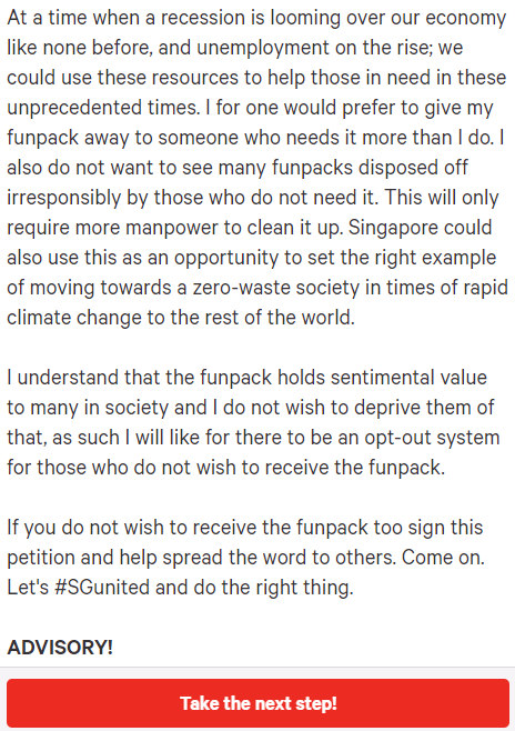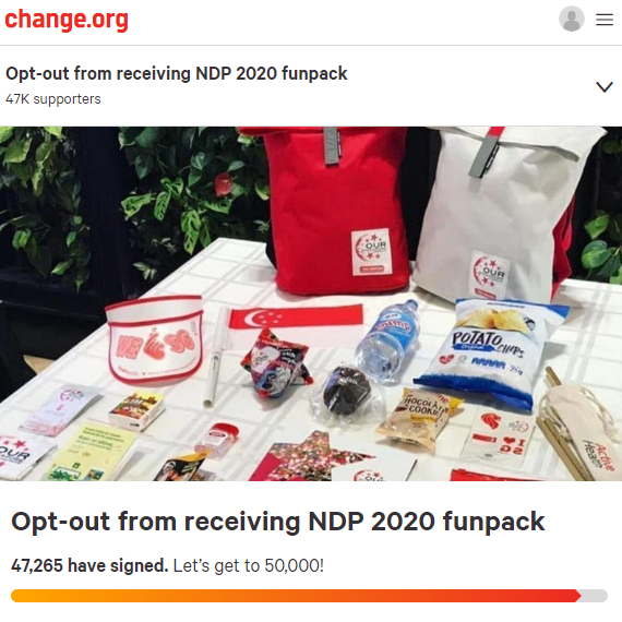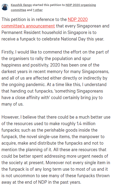 这份请愿书参考了NDP 2020委员会的宣布,即新加坡的每个新加坡居民和永久居民家庭都将获得一个国庆礼包,以庆祝今年的国庆日。