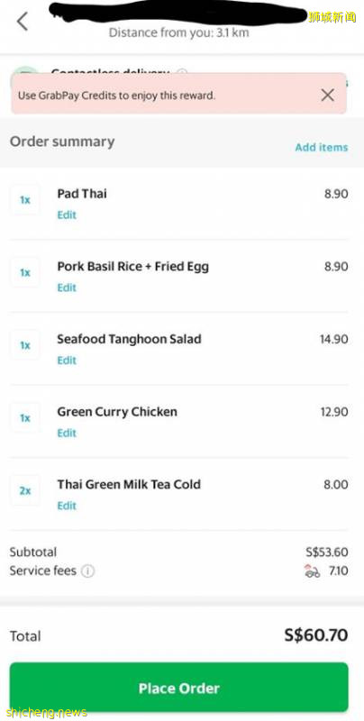 但是同样的食物,通过某外卖平台订购的价格却要53.60新币,比自己亲自打包贵了一半!这还不包括7.1新币的送餐费。