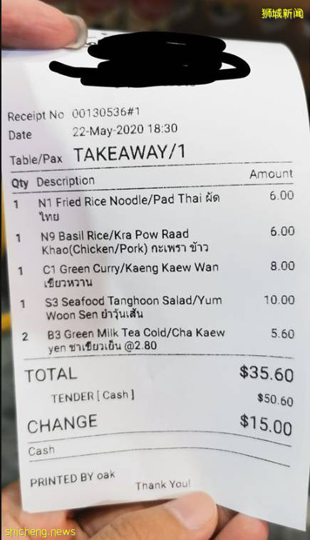 根据网友提供的照片,她亲自打包5份泰国菜的费用是35.60新币。