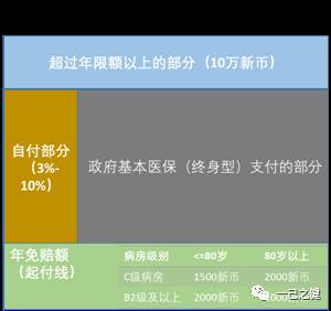 但不可否认的一个共同点是:中国的社会医疗和新加坡的基本健保均为保障终身的“长期医疗保险”,并且无论参保人的既往症史如何均可参保。 新加坡基本健保(MediShield Life) 新加坡基本健保开始于1990年(我国城镇职工基本医保始建于1998年)。期初的基本健保仅保障至90岁,且报销比例仅有80%-90%。由于医疗费用的高速增长,新加坡居民的医疗负担越来越重,在2015年新加坡政府决定加强基本健保的保障力度,一是将保障期限扩展至终身;二是提高保障年限额;三是降低自付比例至3%-10%之间。 基本健保的保费可以100%使用医疗储蓄账户的资金支付。 目前基本健保覆蓋新加坡全部公民和永久居民的,不论是否有既往症均可参与其中,基本健保由新加坡中央公积金管理局(CPF)统筹管理,主要针对的是在公立医院B2和C类病房产生的大额住院费用和指定特殊门诊医疗费用(比如透析和癌症化疗等)。这与我国基本医保仅保障社保定点医院普通部的医疗费用相似。