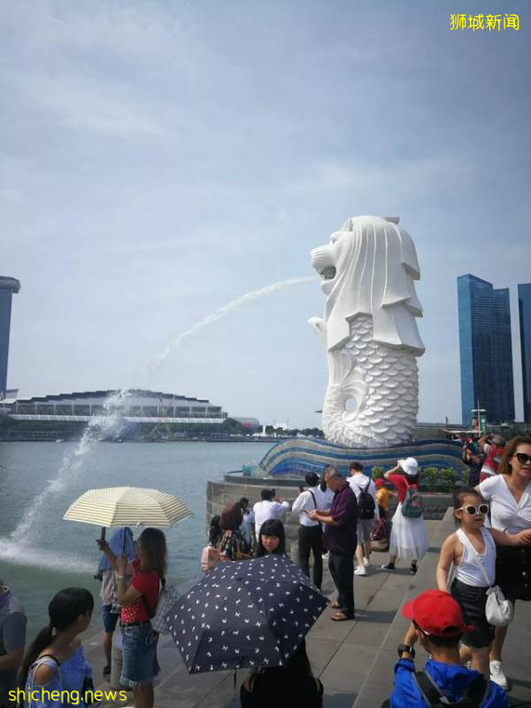 咸咸的海风还没吹拂几分钟,就被同行的伙伴们召唤,匆匆赶回,集体到鱼尾狮公园打卡,与法国的埃菲尔铁塔一样,洁白的狮头鱼尾像也是新加坡的象征。“到此一游”必拍的景点。鱼尾狮雕像下面挤满了人,我还帮一家印度人拍了张全家福。