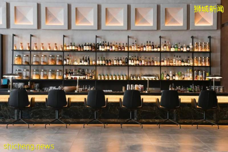 旁边还有个迷你酒吧,摆放着琳琅满目的酒品和香料,在通透灯光映衬下弥漫着浓浓韵味。
