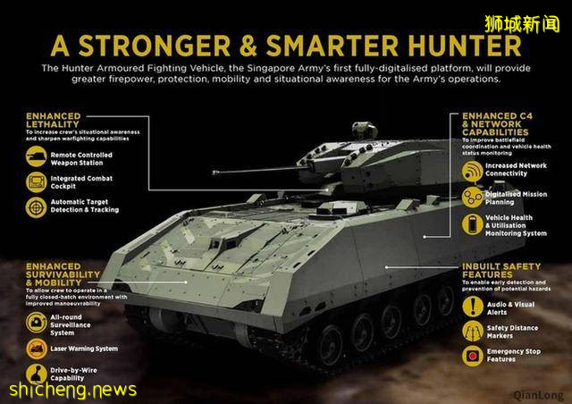 “猎人”步兵战车:该车是新加坡为取代M113A2Ultra履带式装甲运兵车而研发的新一代装甲战斗车辆,信息化程度较高,采用了全新的综合战斗驾驶舱和“陆军战术参与和信息系统”,号称世界上第一款真正全数字化装甲车。