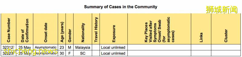2例社区感染病例,1位新加坡公民和1位工作准证持有者,都是卫生部对教育机构工作人员主动检测时发现的无症状感染者, 但是目前还没有找到确切的感染源。