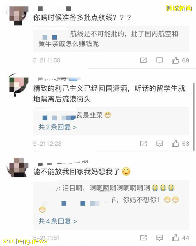 基本上每条微博下面,都有滞留在海外的留学生们在请求民航网重新考虑五个一计划。