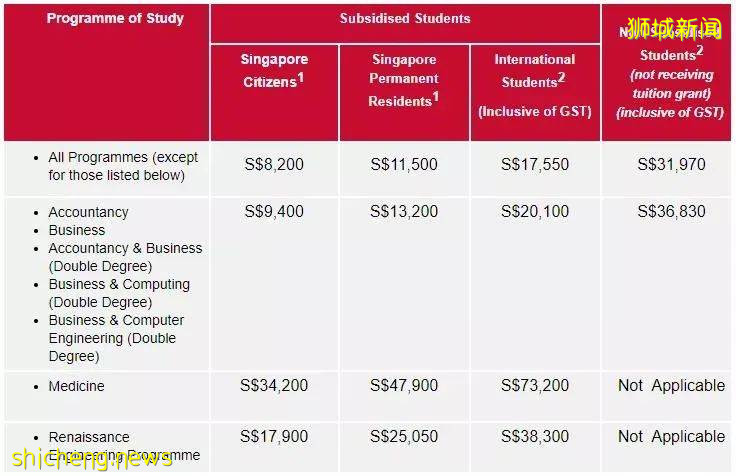 新加坡国立大学2018-2019学年学费(部分)