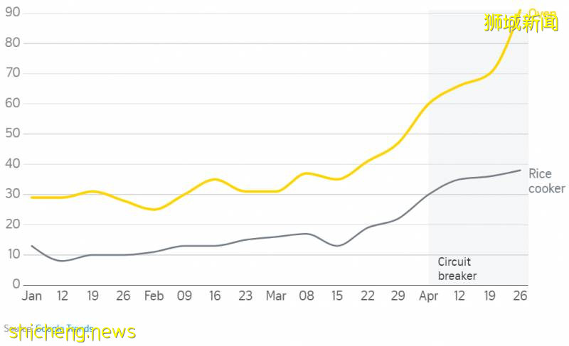 在新加坡封城期间,人们对厨房用具和珍珠奶茶食谱的兴趣激增。