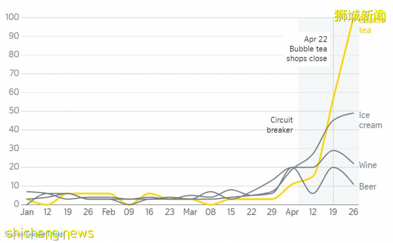 关闭奶茶店并没有阻止新加坡人尝试买到这些饮料,许多人仍在搜寻可买到奶茶的地点。“快递运送奶茶”的搜索量在4月份猛增。