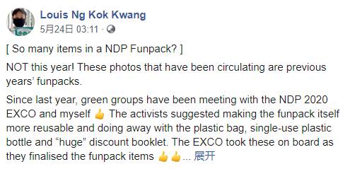 黄国光议员也在24日通过Facebook发帖表示,自去年以来,环保组织和他一直都在与国庆庆典主办方会面。国庆庆典主办方已经采取措施努力减少今年礼包内会产生的废弃物品数量。水瓶、折扣固本、塑料袋将不会出现在今年的国庆礼包中。如果没有爆发疫情,依照举办国庆庆典的话,将会比往几年更环保。
