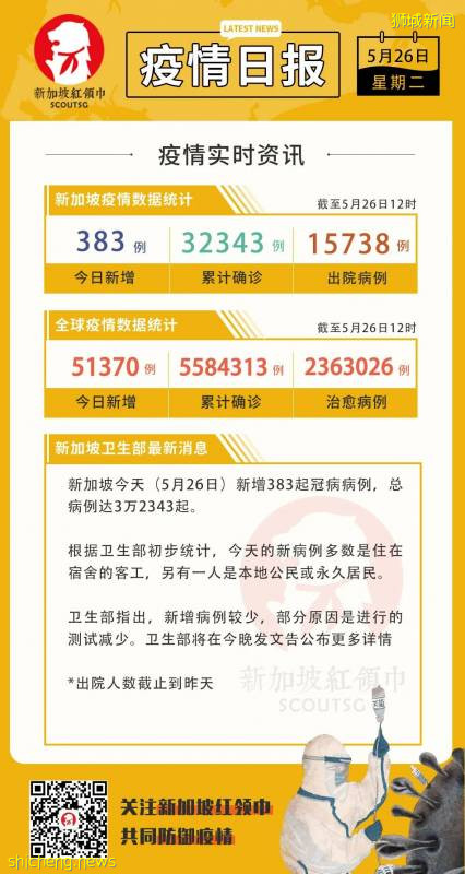 新加坡今日新增383例确诊,
