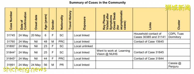 (来源:MOH)确诊病例中,有一位在Learning Vision @ NUHS工作,是一名学前教育机构工作人员。还有两名同样是学前教育机构工作人员,不过他们最近都没有上班。 第四起病例与CDPL大士宿舍集群有关,是一名6岁的儿童;第五起与Cassia @ Penjuru集群有关,是一名56岁的新加坡PR。 在新病例中,有99%与已知集群相关,而其余百分之一的人正在等待联系人追踪。