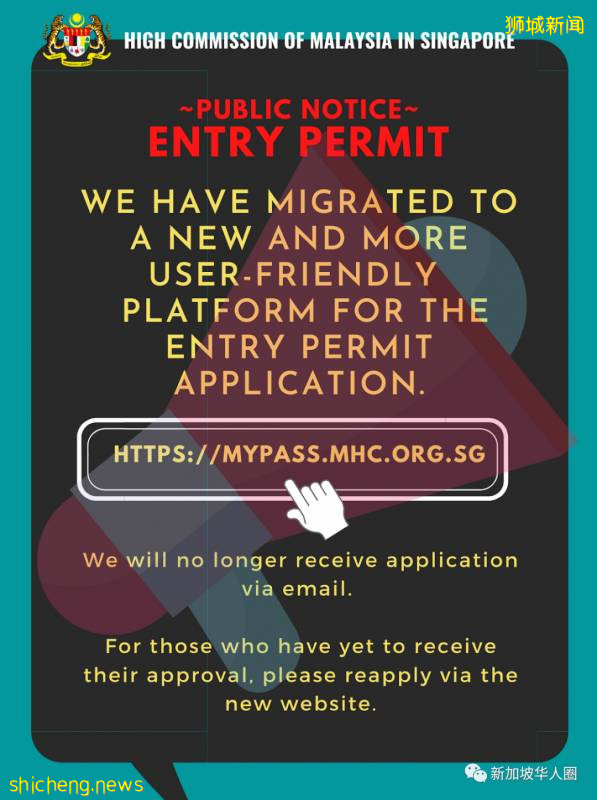 马来西亚驻新加坡最高专员署指示,即日起不接受返马公民的电邮申请入境准证(Entry Permit),欲回大马者须浏览https://mypass.mhc.org(阅读原文查看)。所有电邮申请一律不再受理。