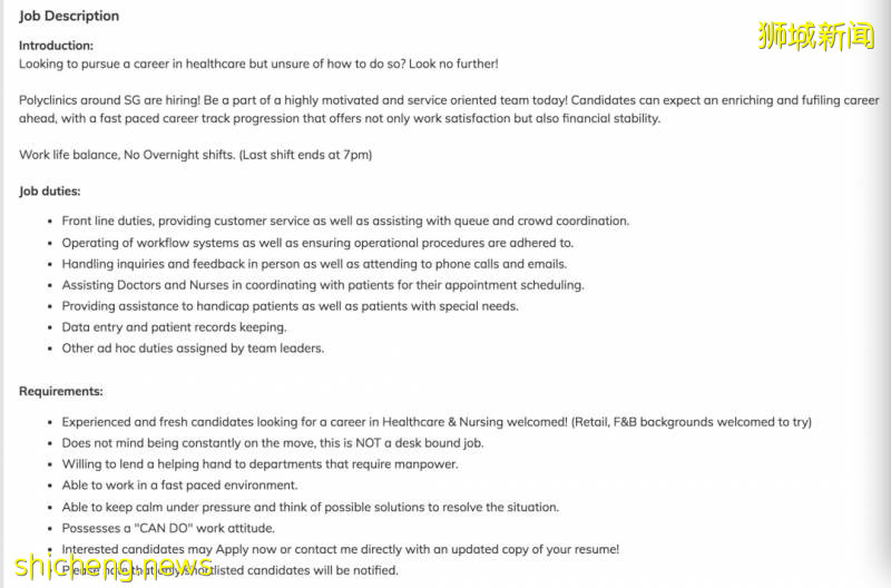 现招聘兼职护理,薪资S$2100-S$2900,至少要有2年的相关经验。