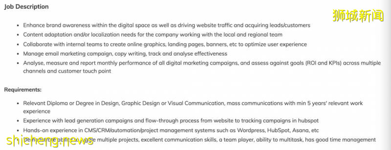现招聘Marketing Manager,薪资S$4500-S$9000,要求在视觉设计方面有相关文凭,至少5年相关经验