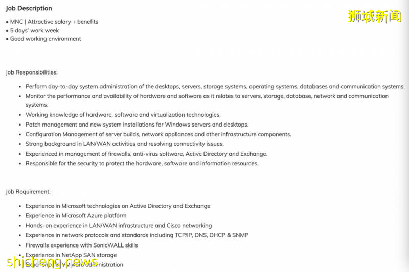 现招聘IT Administor,薪资S$6000-S$8000,要求有LAN/WAN相关经验