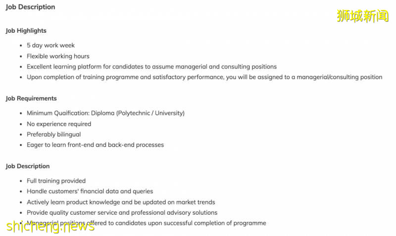 现招聘Management Trainee,薪资S$3000-S$5000,负责顾客的金融数据信息和问题,提供服务和专业解决方案等