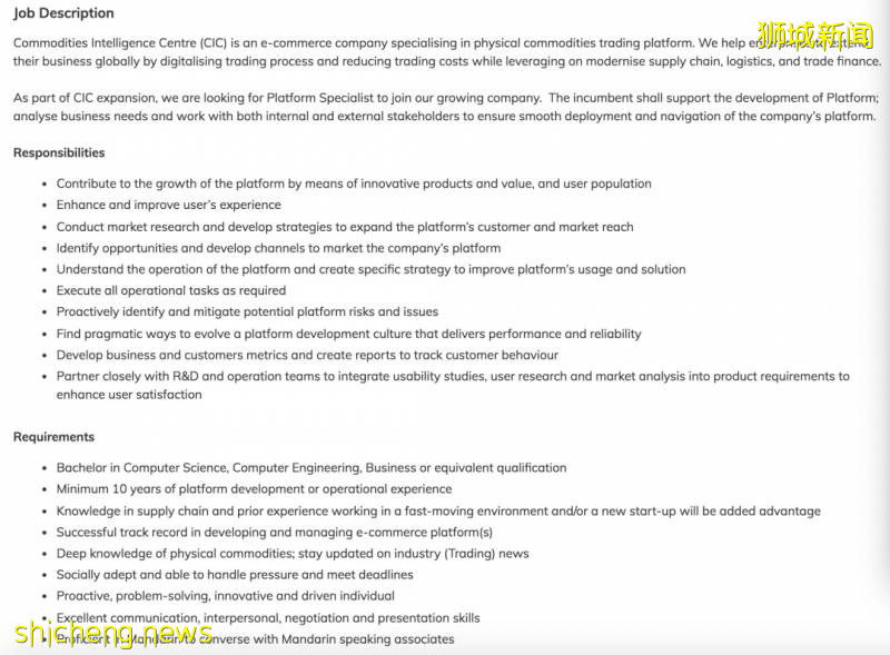 现招聘Platform Specialist,薪资S$6000-S$10000,要求有电脑科学或电脑工程相关文凭,至少10年的平台发展经验。