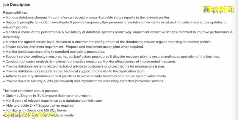 现招聘Database Administor,薪资S$5000-S$7000,要求至少3年相关经验,熟悉Oracle 以及 MS SQL Server。