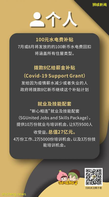 政府有关部门将会通过“新心相连”就业及技能配套(SGUnited Jobs and Skills Package),提供10万份就业与培训机会,让9万9500人收受益,总值27亿元。