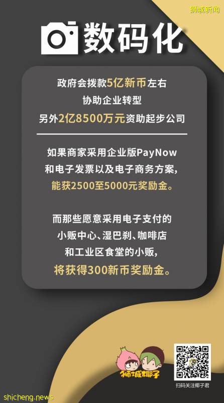 政府会拨款5亿新币左右协助企业转型,另外2亿8500万元资助起步公司。