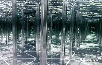 以花园为主题的镜子迷宫是一个光怪陆离的感觉。迷宫上方是层层绿阴,通过镜子面折射,仿佛有无尽的绿林覆蓋。
