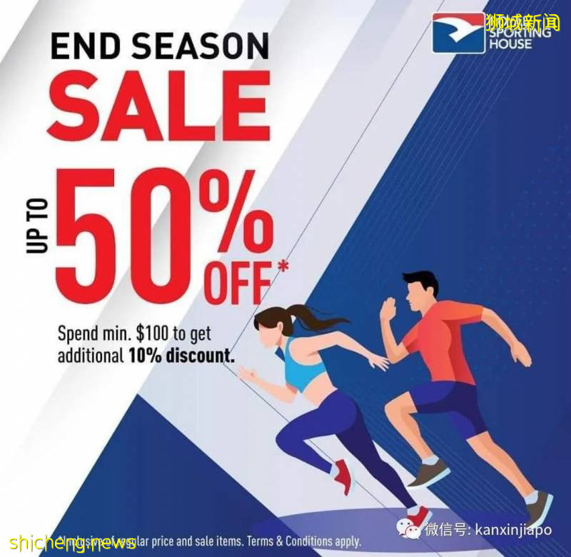 Nike、Adidas、Reebok品牌运动产品等有高达50%折扣,消费100新币还可享有额外10%折扣哦。